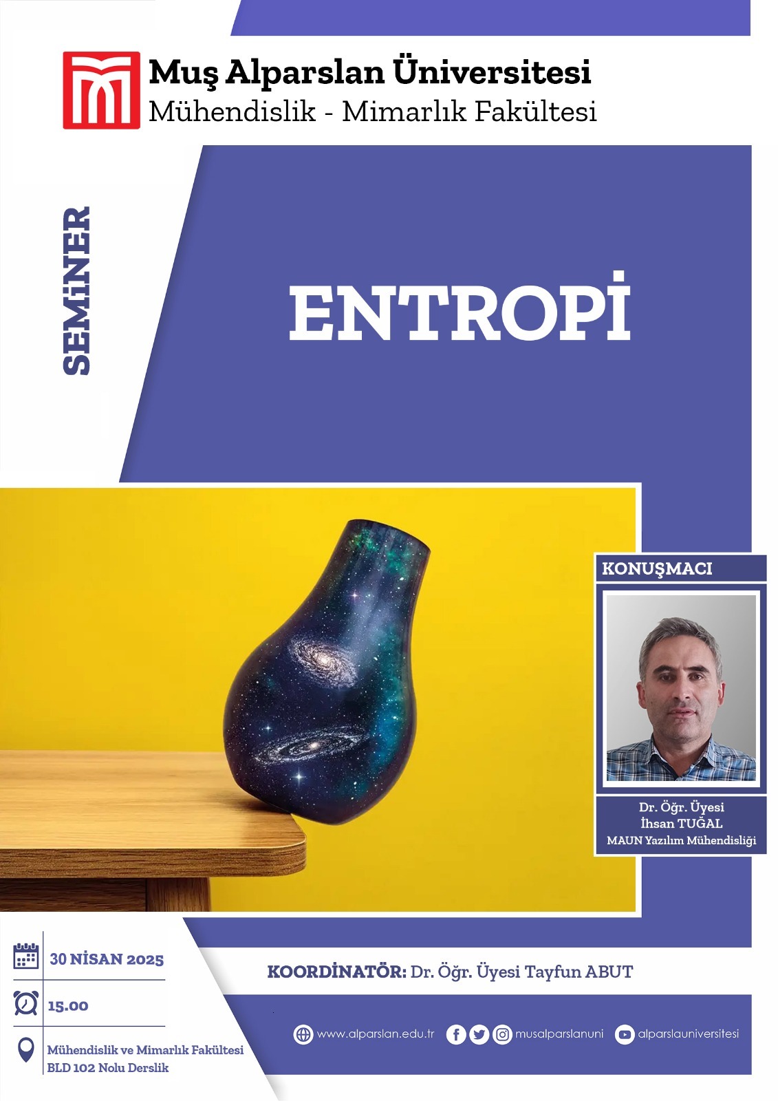 Dr. Öğretim Üyesi İhsan TUĞAL Tarafından 30/04/2025 Çarşamba Günü Saat 15:00'da "Entropi" Konulu Seminer Düzenlenecektir. Katılımınızı Bekleriz.