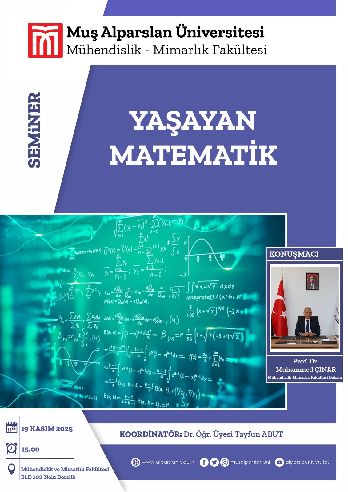 Fakültemizin Dekanı Prof. Dr. Muhammed ÇINAR Tarafından 19.11.2025 Çarşamba Günü Saat 15:00'da "Yaşayan Matematik" Konulu Seminer Düzenlenecektir. Katılımınızı Bekleriz.