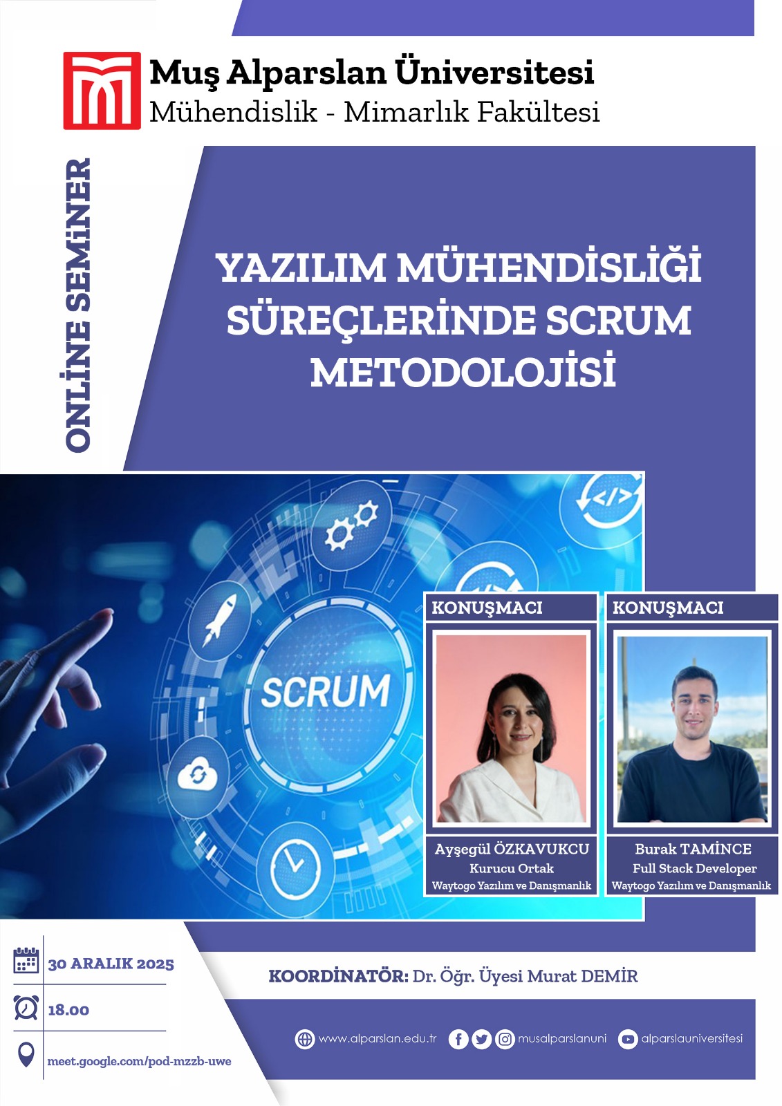 Ayşegül ÖZKAVUKCU (Waytago Yazılım ve Danışmanlık Kurucu Ortağı) ve BurakTAMİNCE (Waytago Yazılım ve Danışmanlık Full Stack Developer) Tarafından 30/12/2025 Salı Günü Saat 18:00'da "Yazılım Mühendisliği Süreçlerinde Scrum Metodolojisi" Konulu Seminer Çevrimiçi Düzenlenecektir. Katılımınızı Bekleriz.